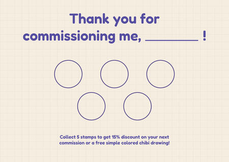 ✧ receive one stamp per commission!✧ if you've commissioned me 5 times, you'll be eligible for a 15% discount for the next commission or a free simple colored chibi drawing!